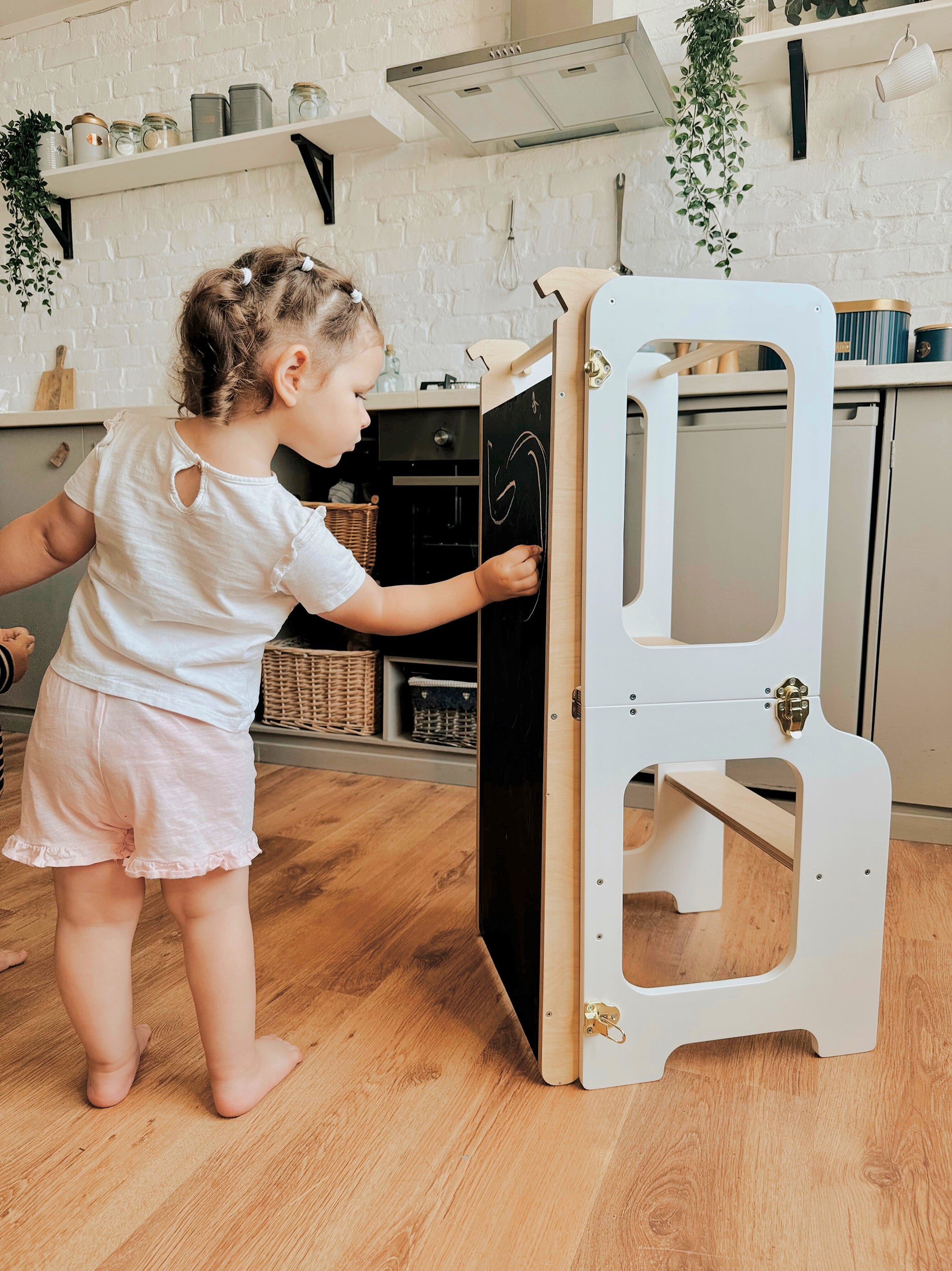 Discover a unique, elegant, and practical design with the 4 in 1 Kids Learning Step Stool. It easily converts into multiple useful setups to keep children engaged in everyday activities. Children can help in the kitchen, learn to cook, wash dishes, or brush their teeth. It also transforms into a desk for drawing or mealtime, a chalkboard for creativity, and even a slide for fun playtime.