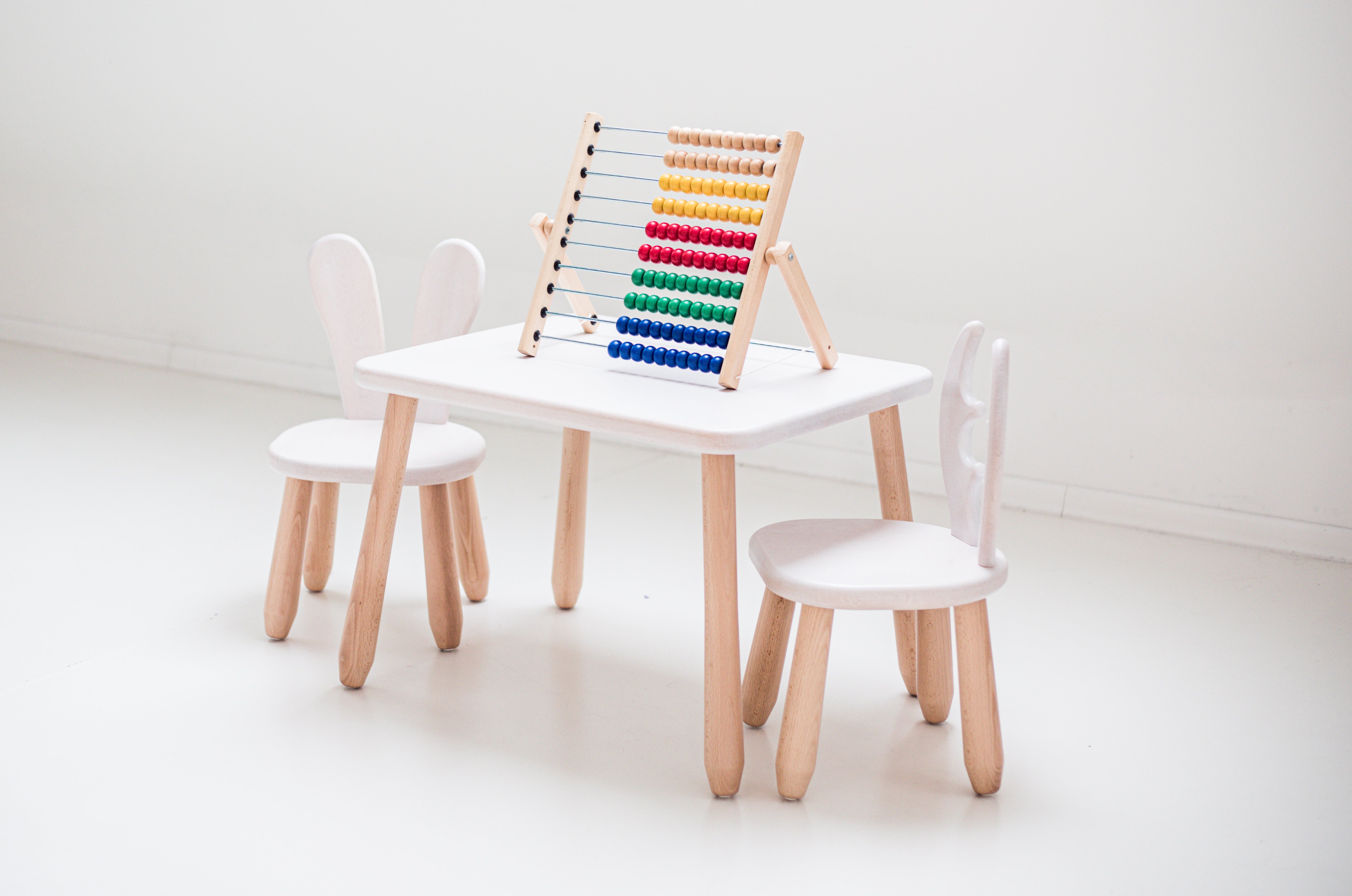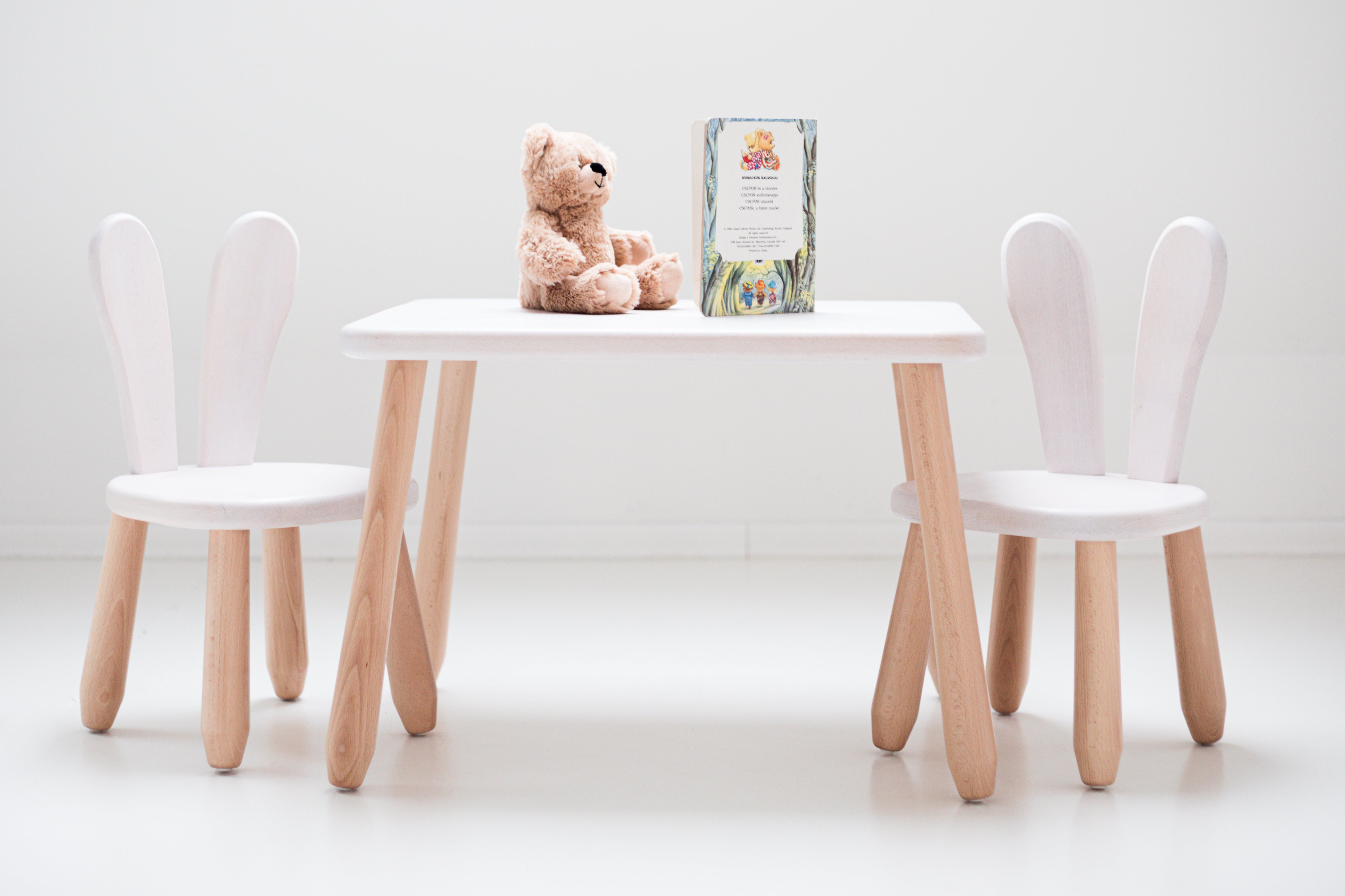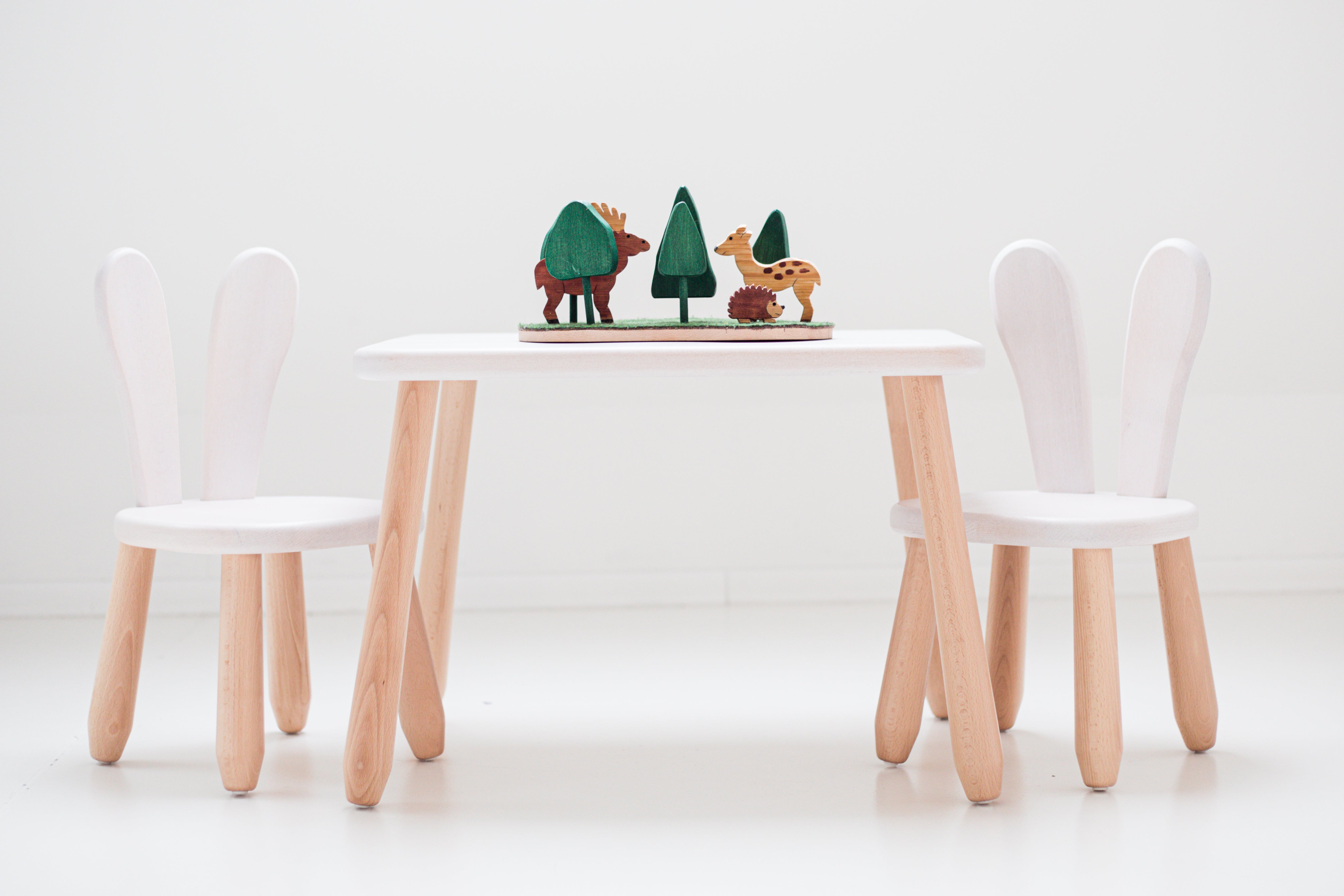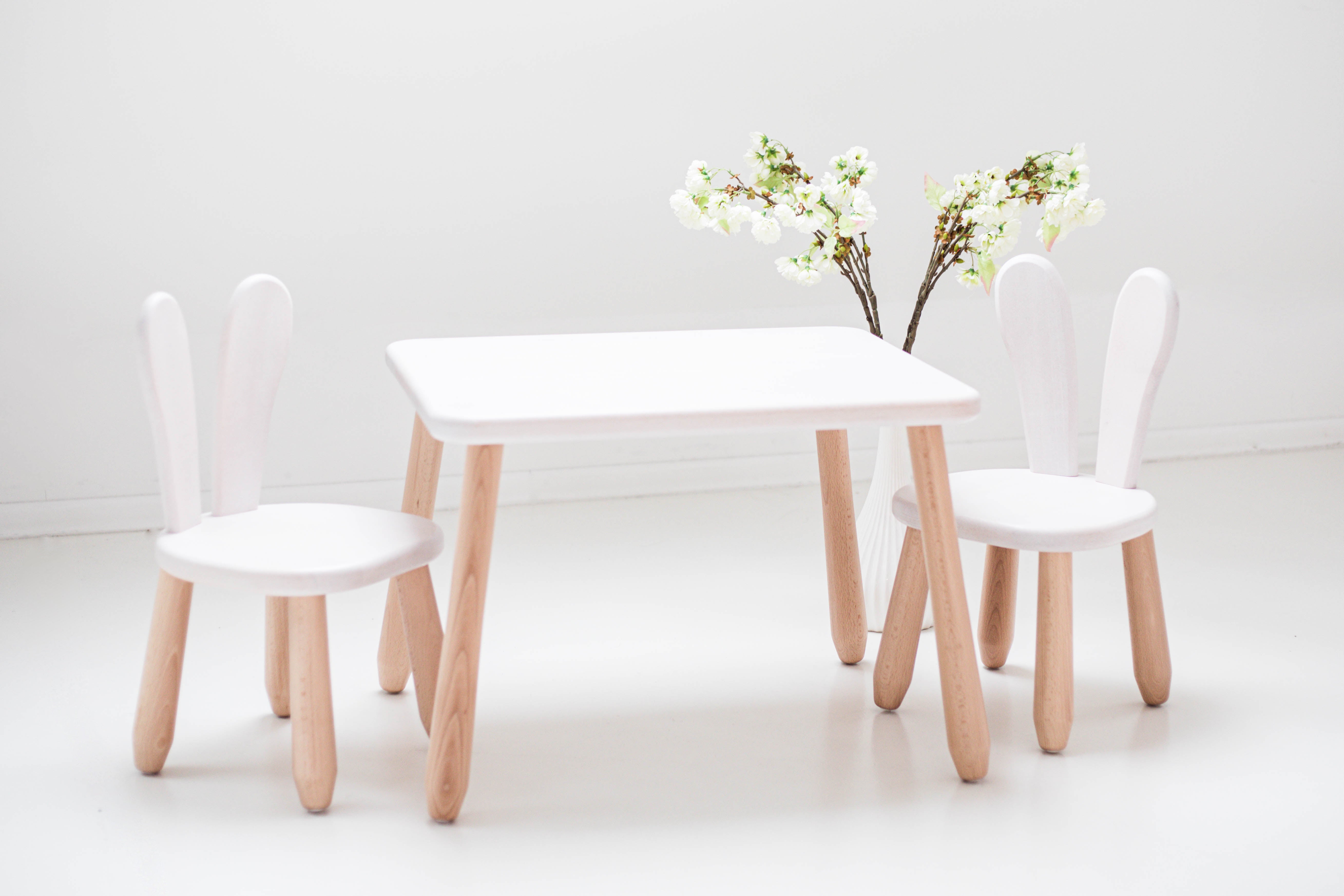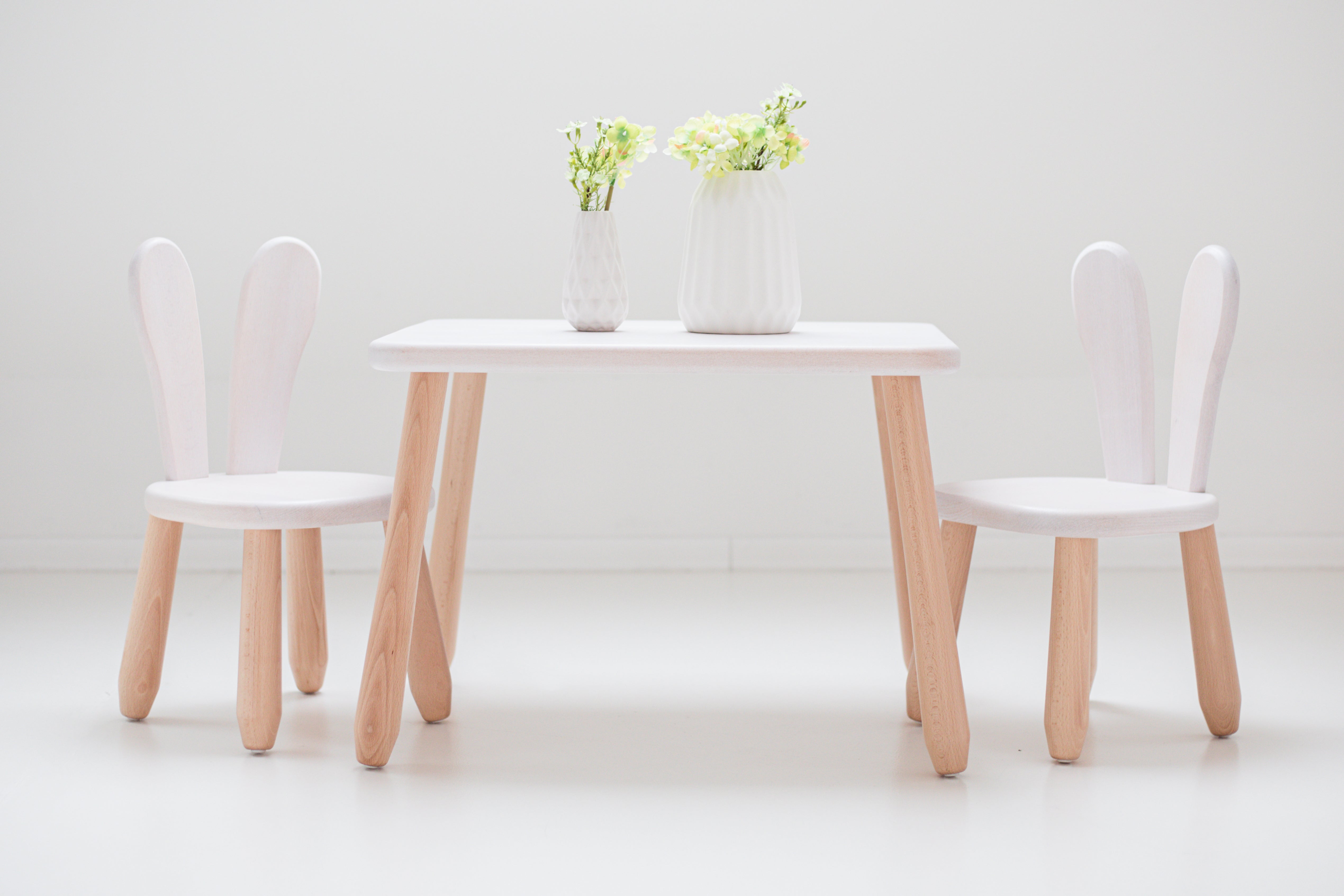 - Set includes: 2 bunny shaped wooden chairs and 1 children’s table